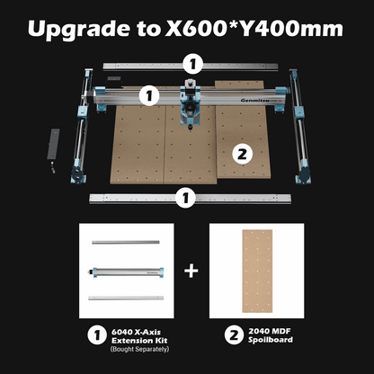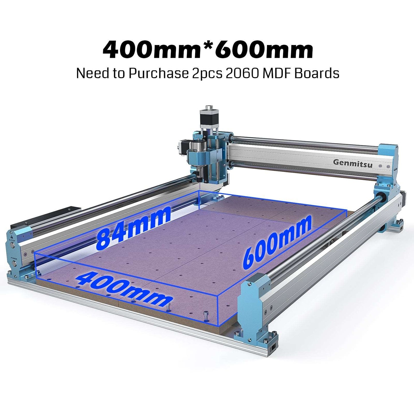 For a working area of X400mm x Y600mm, you'll need two pieces of MDF spoilboards. To attain a luxurious working area of X600mm x Y600mm, three pieces of 2060 MDF board are required. Please note that the XY-Axis aluminum extension profile kit needs to be purchased separately.