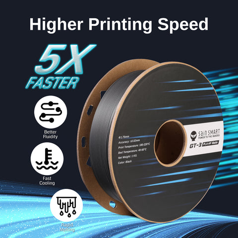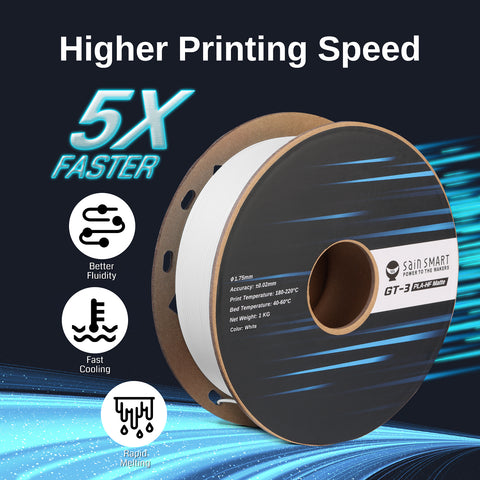 The SainSmart GT-3 PLA filament is designed to balance high printing speeds of up to 500mm/s with printing quality. Its excellent fluidity and viscosity factors reduce stringing and sagging, taking your printing to the next level. For optimal results, we recommend a printing speed of around 300 mm/s.