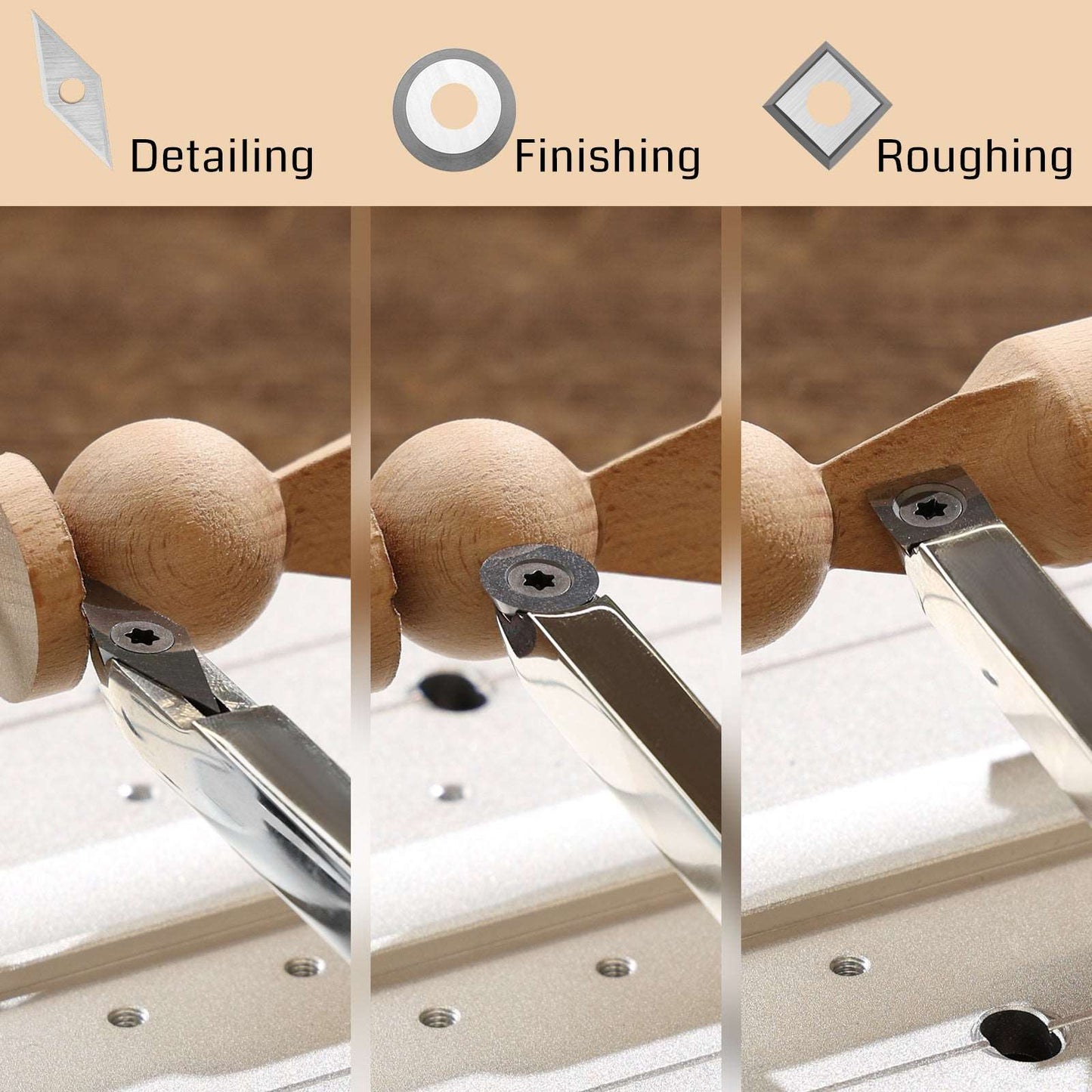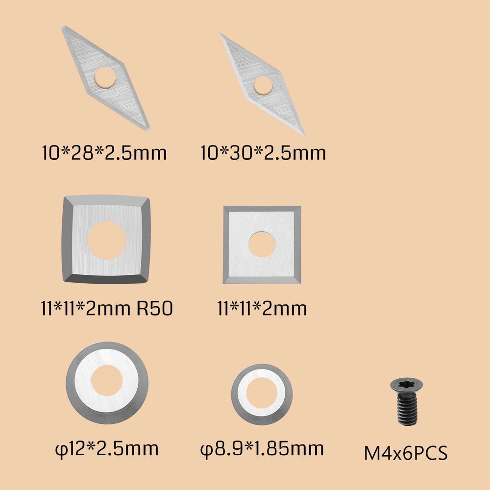 Value Pack: This package includes 18 pieces of various shapes, meeting all your wood turning needs. Shapes include 11 mm Square, 11 mm Square with Radius, 12 mm Round, 8.9 mm Round, and two diamond cutters of sizes 30x10 mm and 28x10 mm.
