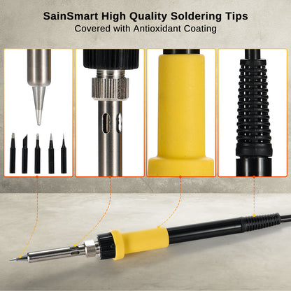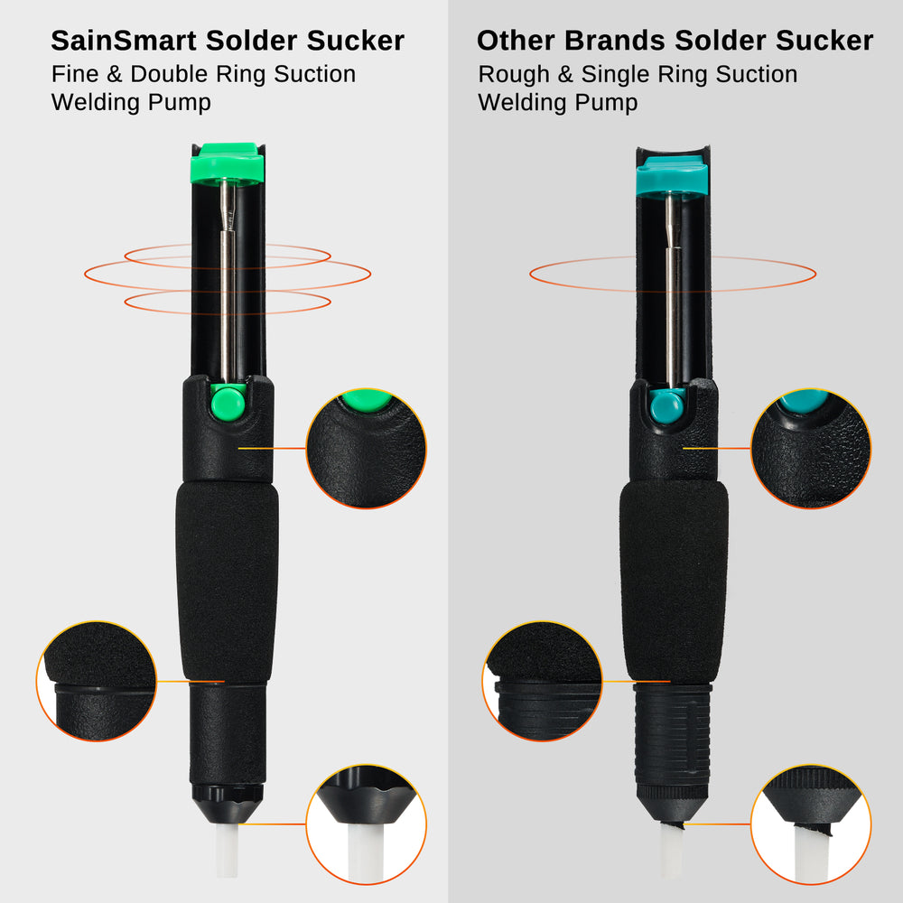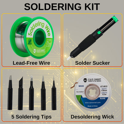 SainSmart soldering station equipped with 1 lead-free cable, 1 solder sucker, 1 desoldering wick and 5 soldering tips. All solder bits are coated with an anti-oxidation coating, so they will not oxidize as quickly as other brands of soldering iron tips. Also, unlike a normal solder sucker with a single ring suction welding pump, SainSmarts solder sucker is high quality and comes with a double ring suction welding pump which can provide a stronger suction power.
