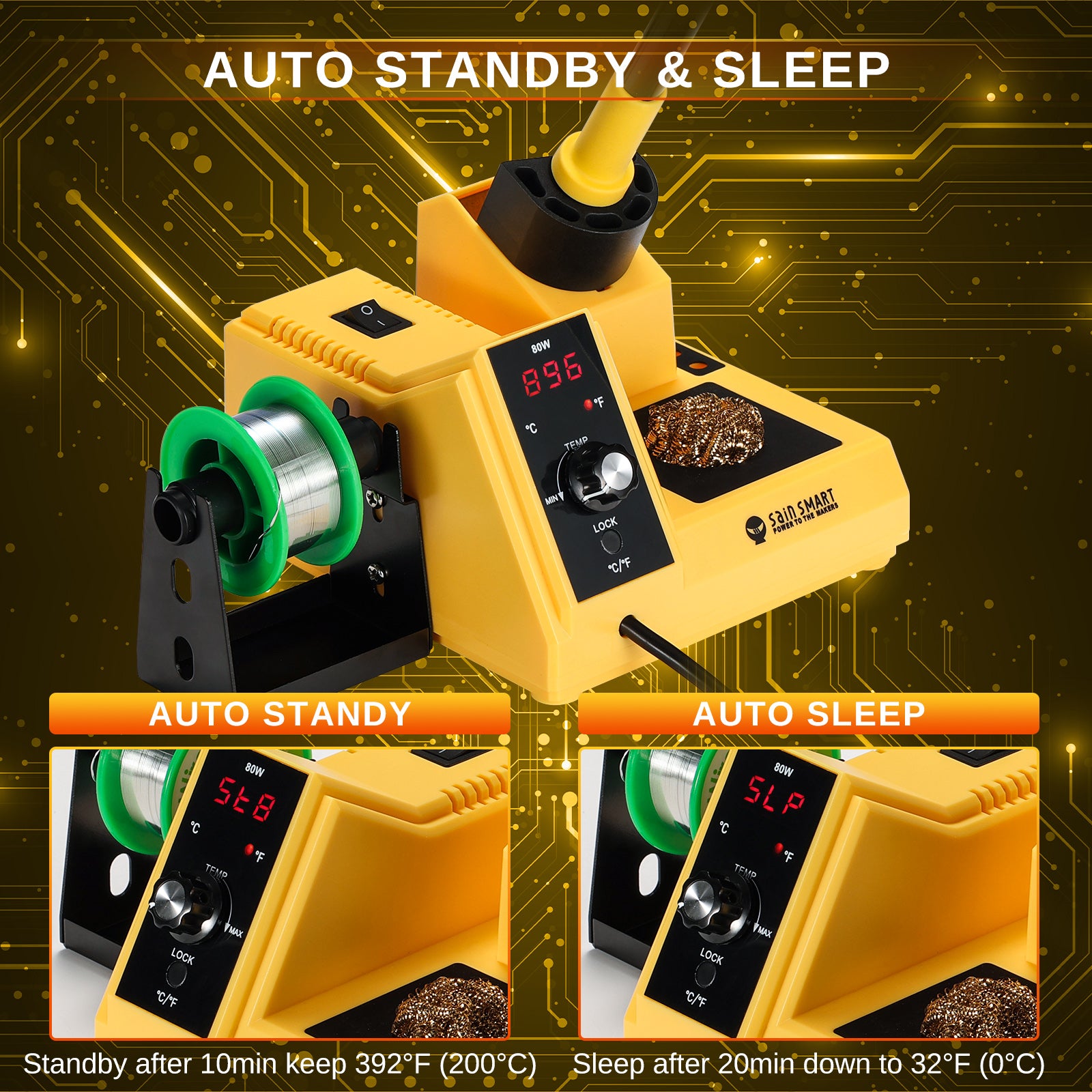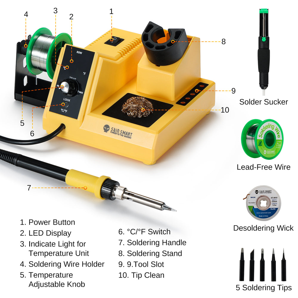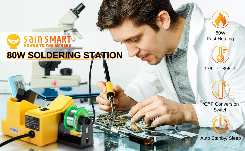 SainSmart 80W soldering station has strong power and rapid heat up feature. It only takes 5.5 seconds to reach the solder temperature 361° F . Adjustable temperature range from 176°F to 896° F (80°C to 480°C), which helps you do the soldering job much faster.