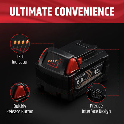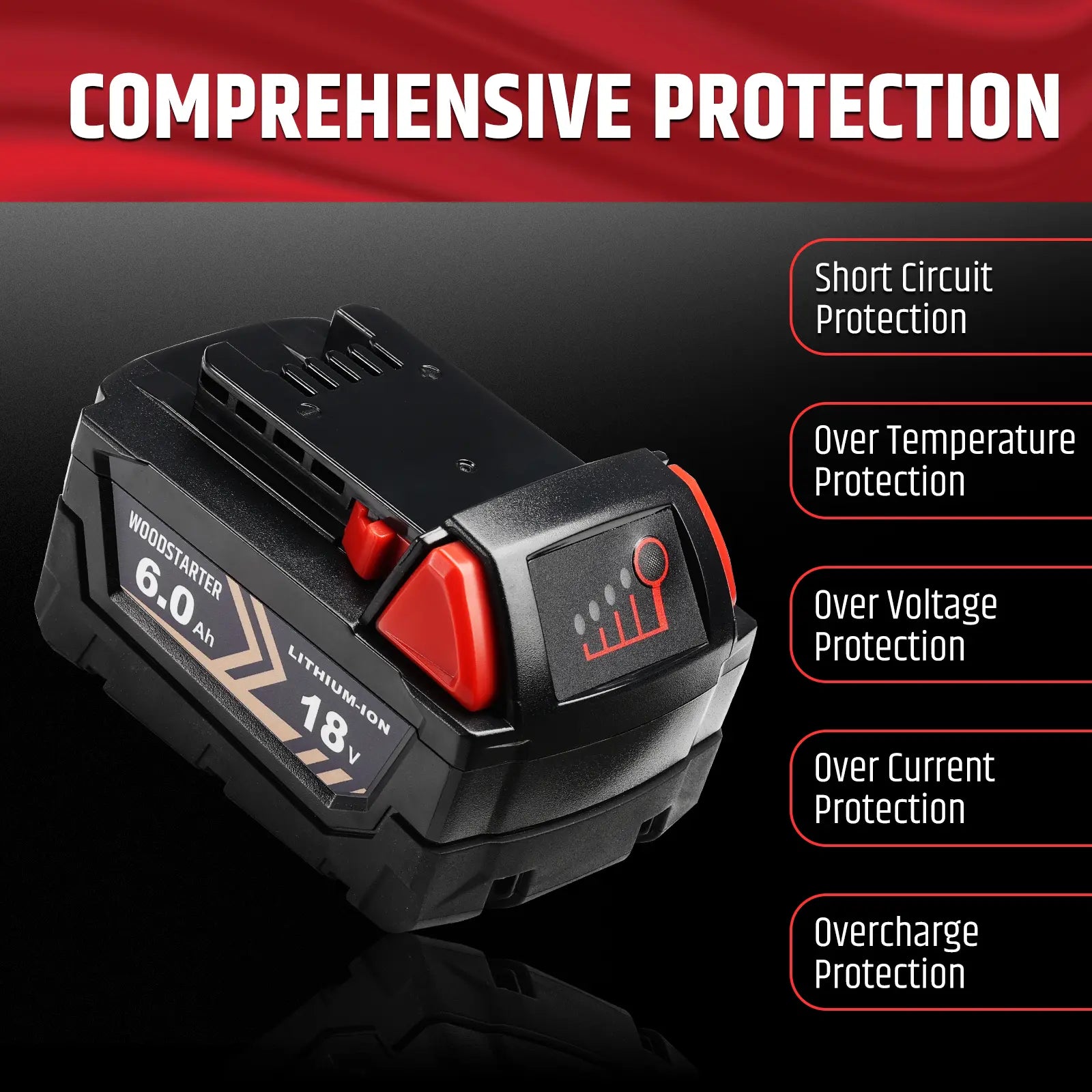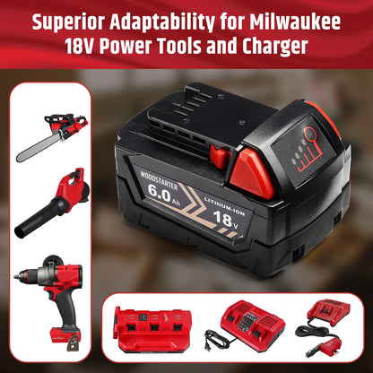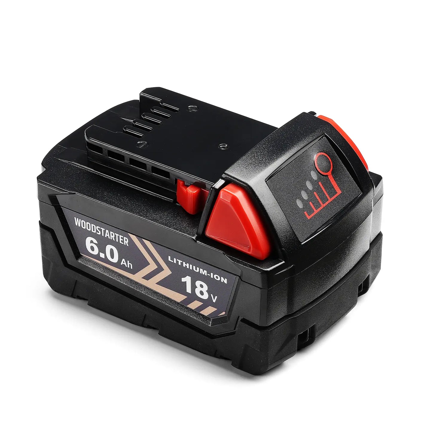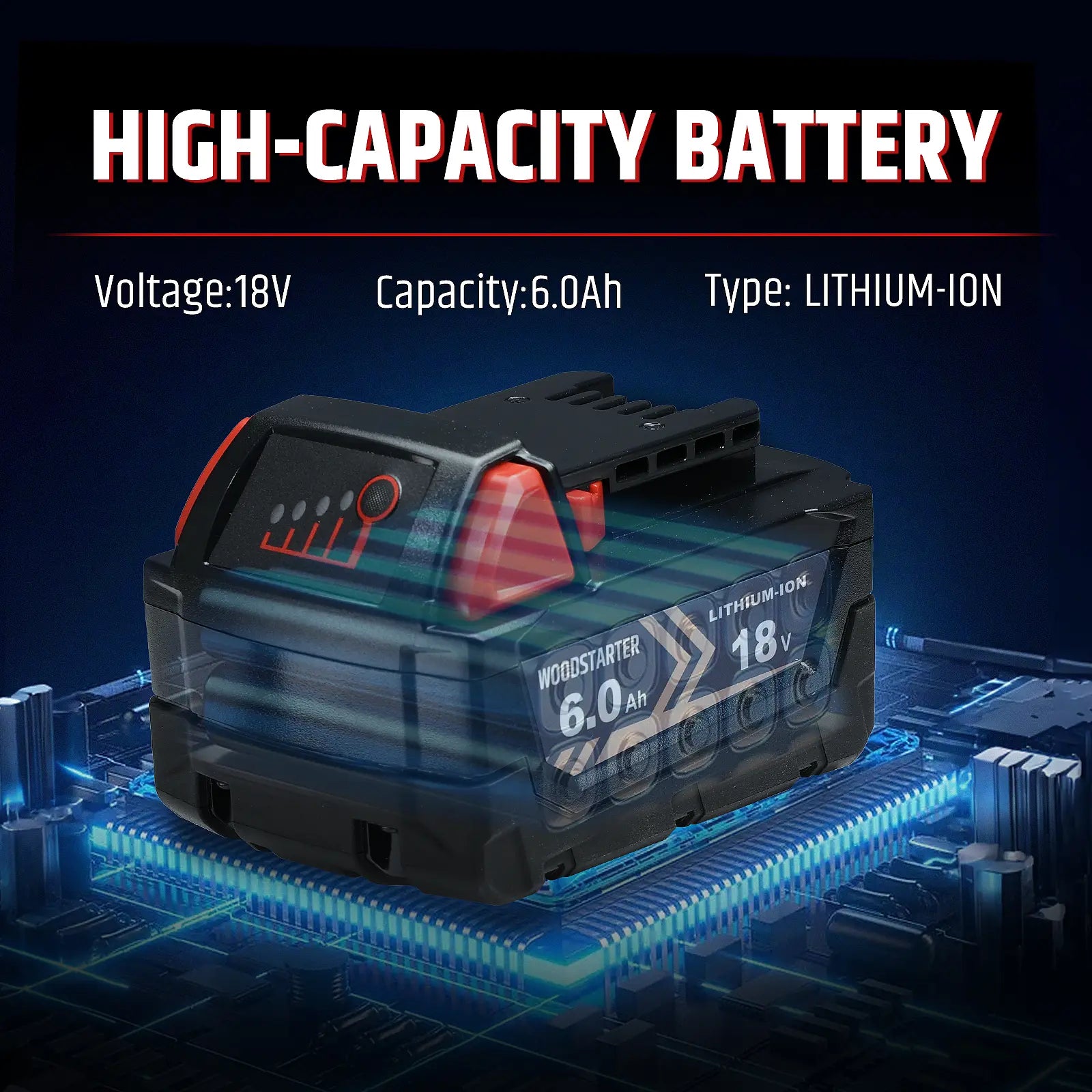To maximize the lifespan of your WOODSTARTER 18V 6.0Ah battery, it's recommended to store it in a cool, dry place when not in use. Avoid storing it in extreme temperatures. If you’re not using the battery for an extended period, recharge it to about 50-70% to keep it in optimal condition. Always ensure the battery is used in the appropriate M18 tools to avoid wear and tear.