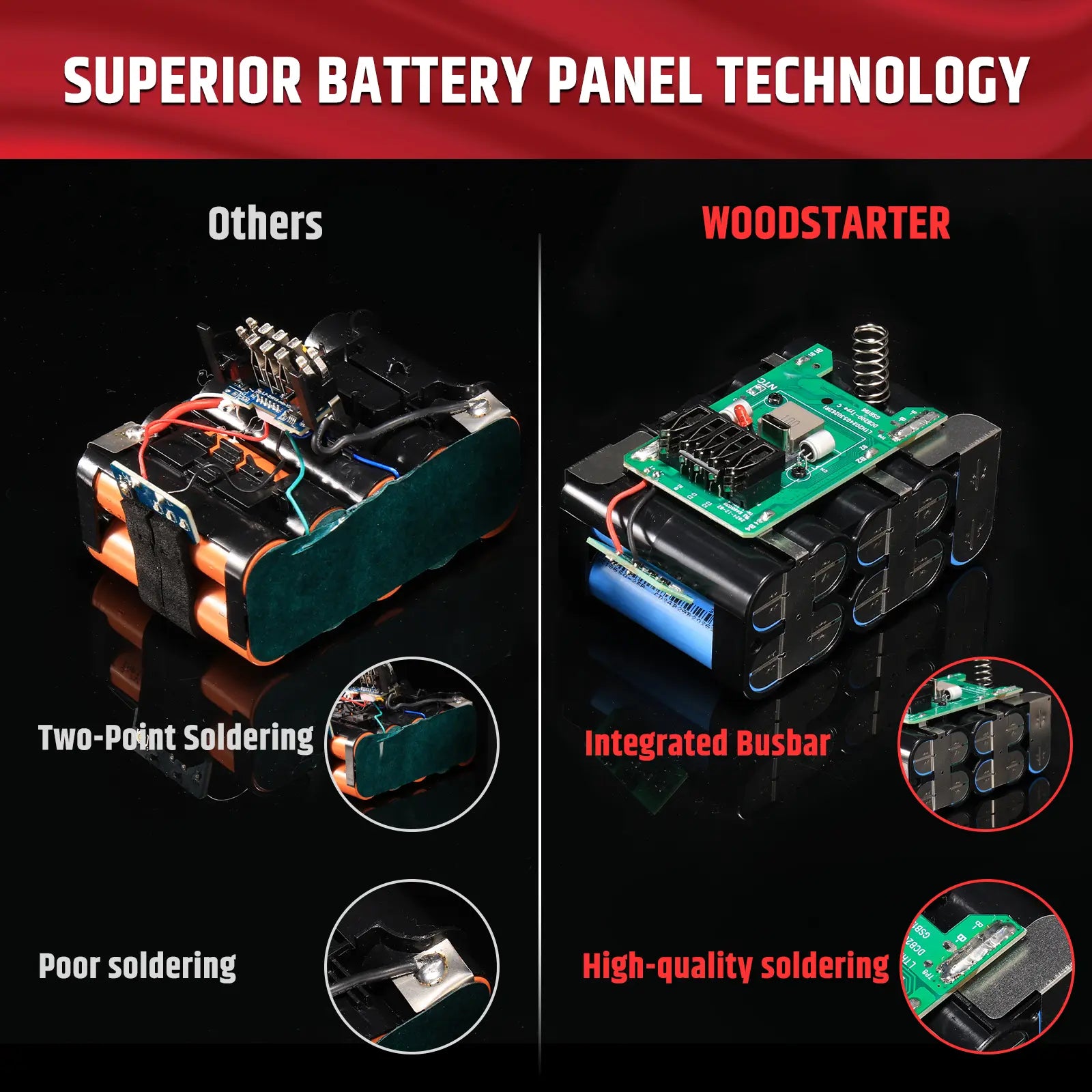 While the WOODSTARTER 18V battery has built-in protection to prevent damage in extreme conditions, cold weather can reduce its performance and runtime. If you're working in cold environments, try to store the battery in a warmer location before use. The battery is designed for reliable performance in typical outdoor conditions, but extreme cold may cause temporary decreases in efficiency.