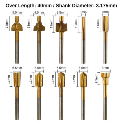 10pcs Titanium Coat HSS Router Bits Set