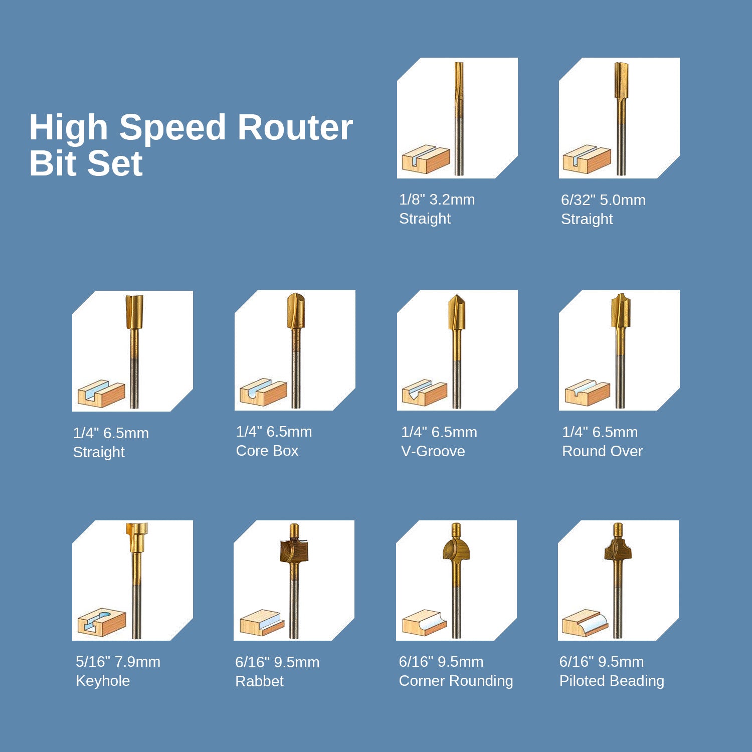 Includes the most commonly used router bit types, straight, trim, V groove, beading, cove, slot cutter, and more to meet your different needs. Great for all types of detail work in woodworking.