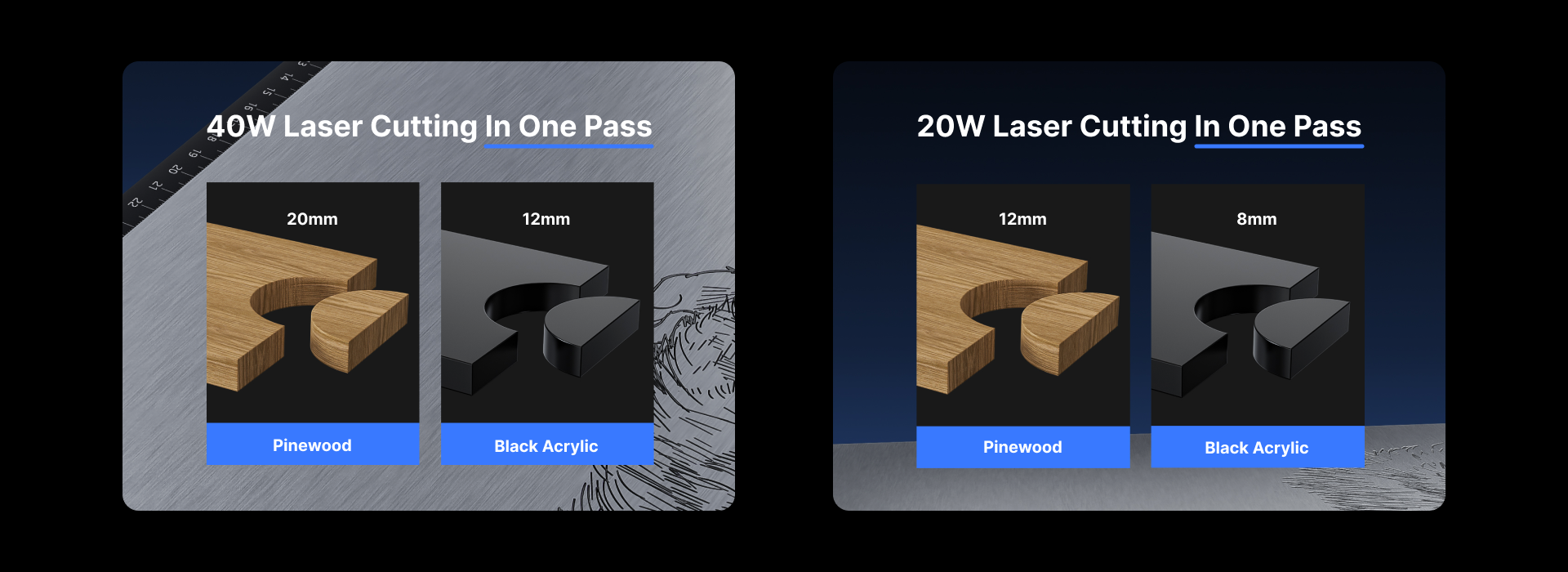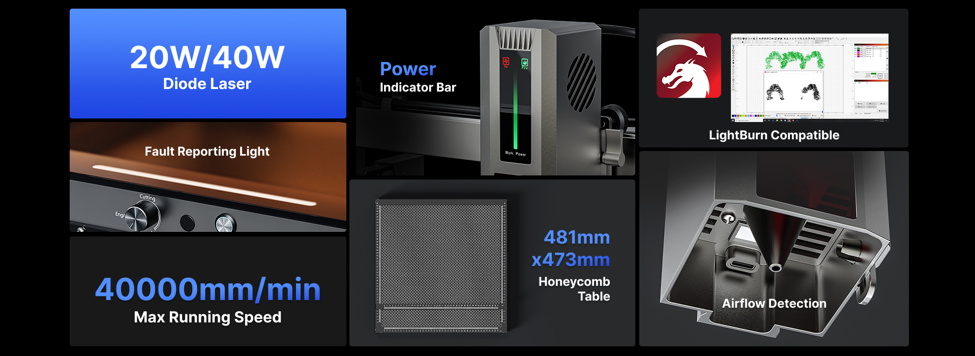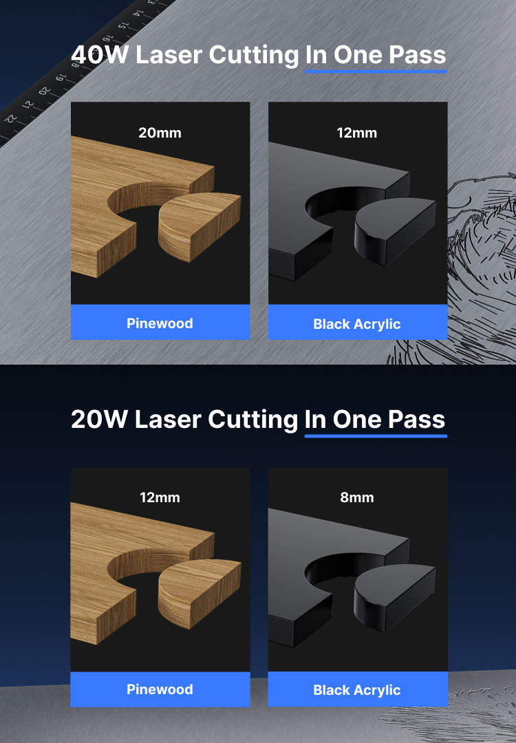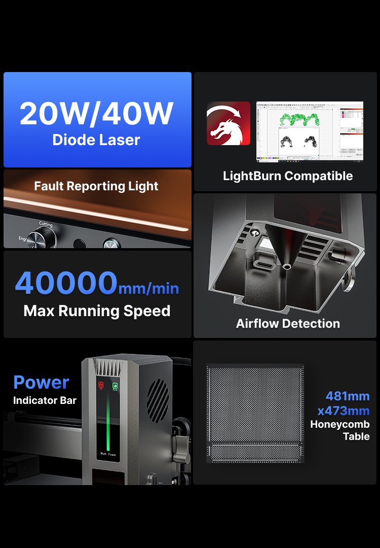 | Engraving Size | 20W: 400 * 400mm; 40W: 390 * 390mm | |