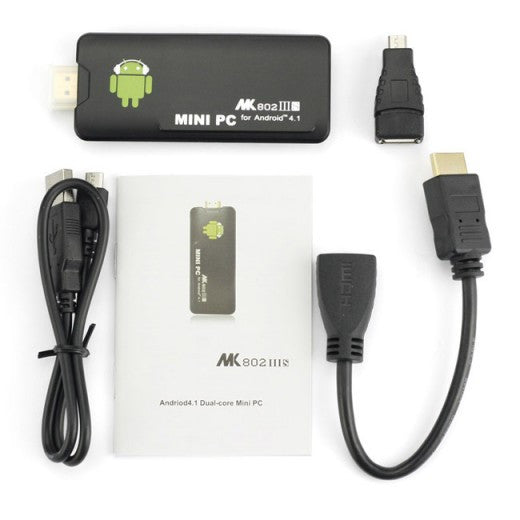 MK802 IIIS .The little computer runs Google Android 4.1 and it's designed to be plugged directly into the HDMI port on a TV. You can hook up a mouse and/or keyboard to navigate through the Android interface.