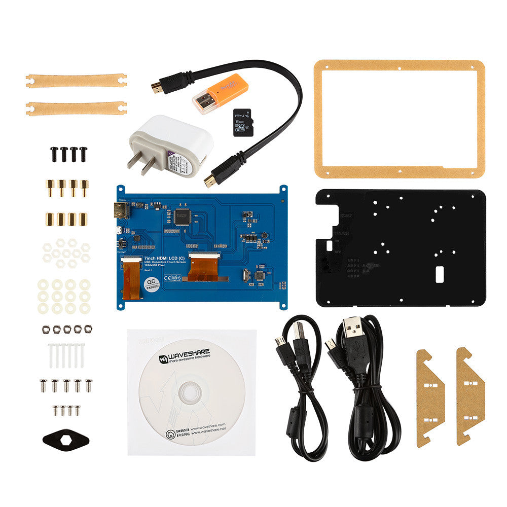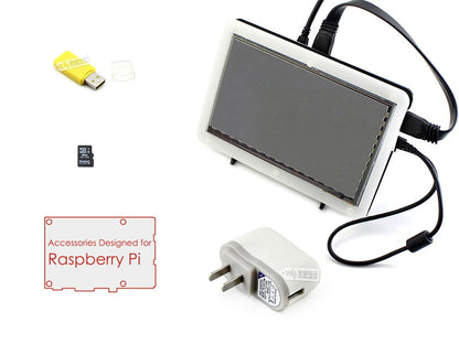 An accessories pack (type F) to be used with Raspberry Pi. It consists of 7inch HDMI interface touch screen LCD, a bicolor case, an 8GB Micro SD card, a 5V/2.5A USB power adapter, etc. This accessories pack makes it easy to set up your Pi into an All-in-one device.
