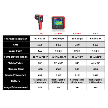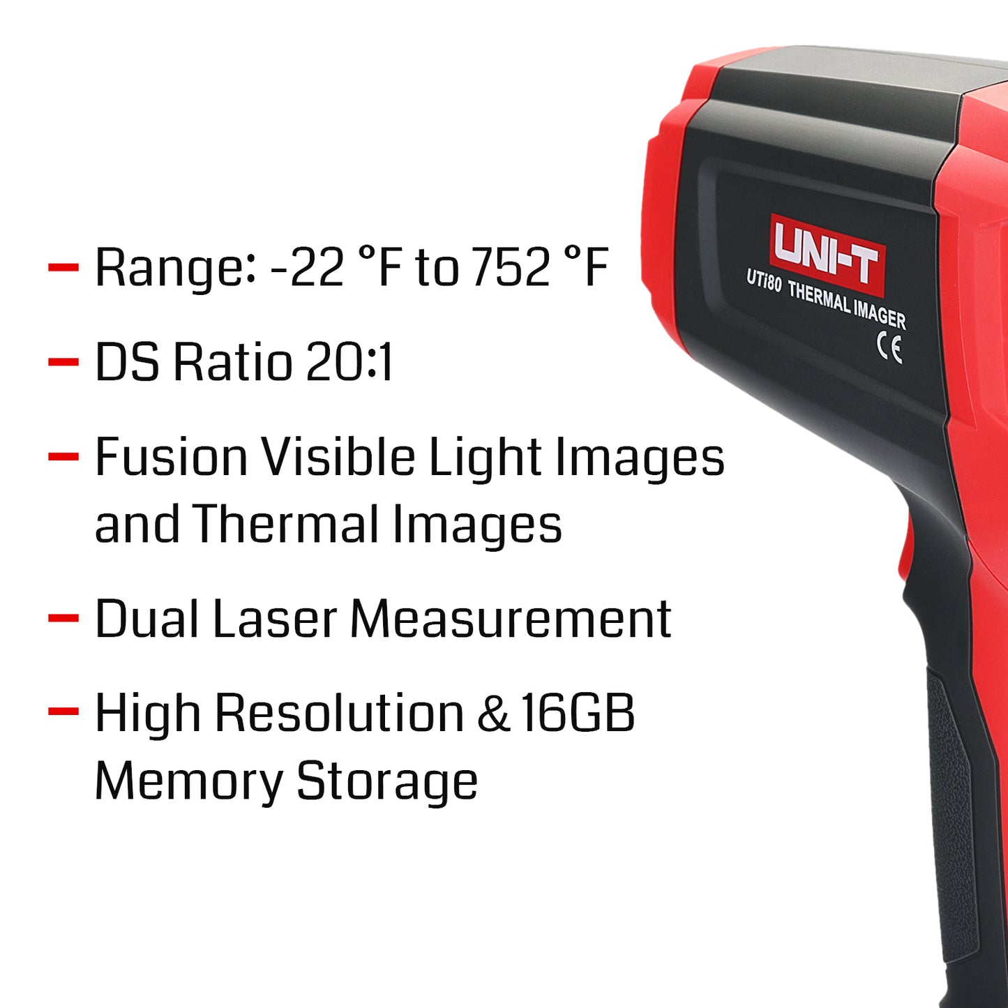 The UTi80 features thermal imaging and displays hot and cold spots on the screen, allowing users to more effectively observe object temperature changes. The dual laser transmitter helps you quickly lock on to the target area. The standard 8GB memory card can store a large number of images and data while generating high-quality infrared images, which is a good tool for troubleshooting and later documentation.